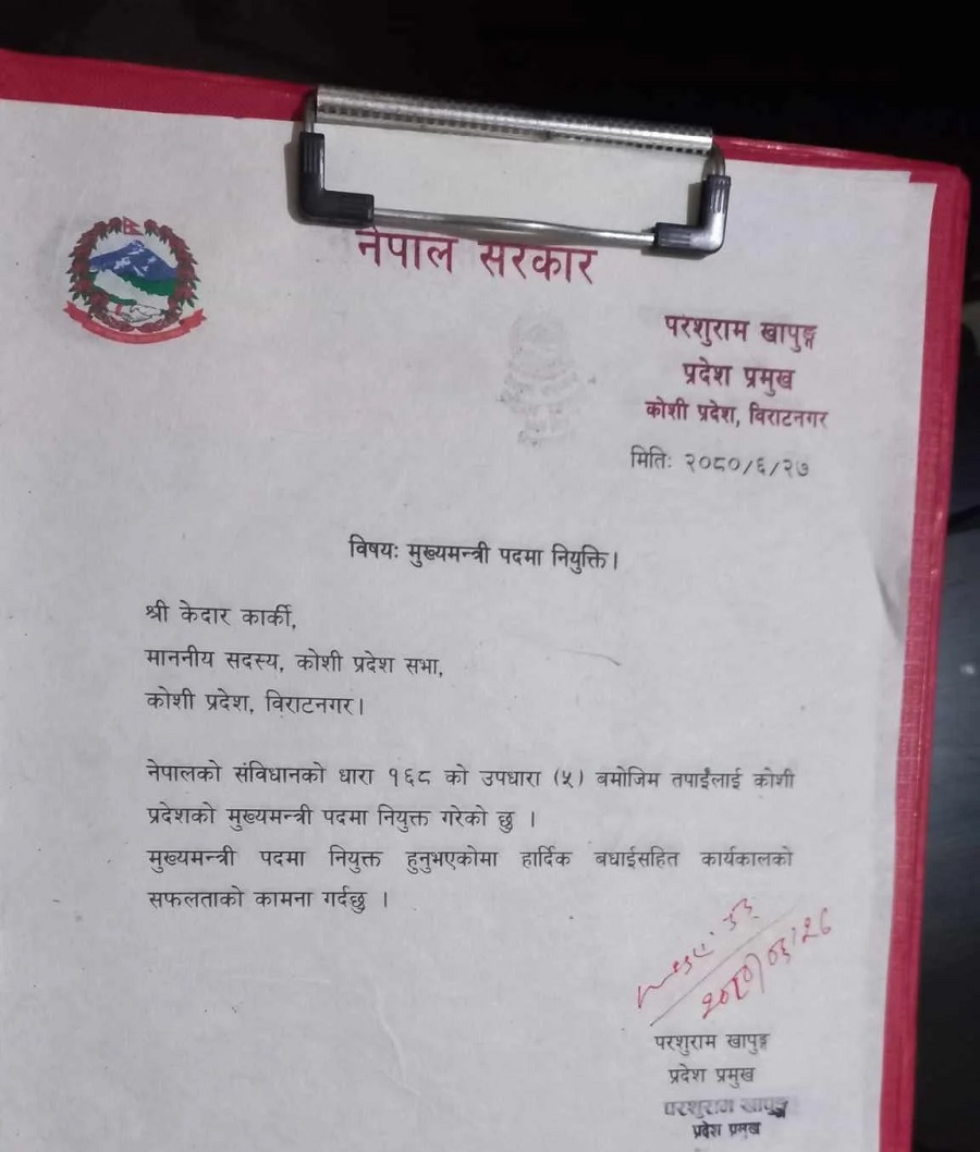 काठमाडाैं ।  कोशी प्रदेशको मुख्यमन्त्रीमा कांग्रेस सांसद केदार कार्की नियुक्त भएका छन् । प्रदेश प्रमुख पर्शुराम खापुङले उनलाई समर्थन गर्ने एमालेका ३९ र काँग्रेसका ८ सांसदको हस्ताक्षर सनाखत गरेपछि मुख्यमन्त्रीमा नियुक्त गरेका हुन् ।