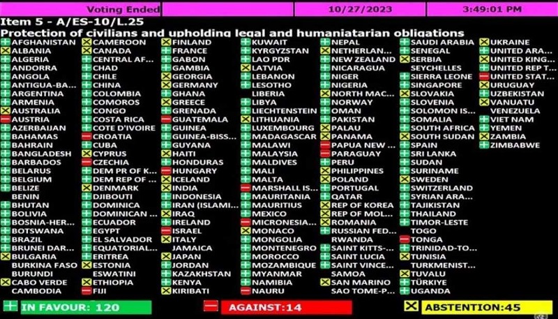 जोर्डनको प्रस्तावको विपक्षमा अमेरिका, इजरायल, अष्ट्रिया, हंगेरीलगायत १४ देशले मतदान गरेका छन् । भारतसहित ४५ देश तटस्थ बसेका छन् ।