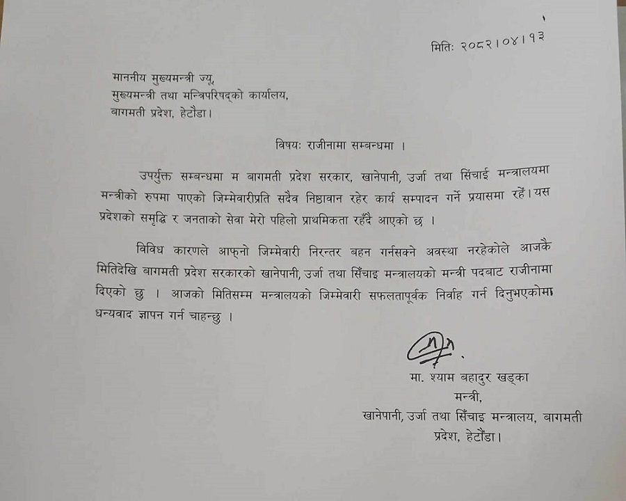 हेटौडा । बागमती प्रदेशका खानेपानी ऊर्जा तथा सिँचाइमन्त्री श्यामबहादुर खड्काले राजीनमा दिएका छन् ।