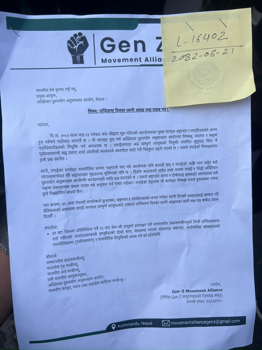 काठमाडौं । ‘जेनजी मुभमेन्ट अलायन्स’ले अख्तियार दुरुपयोग अनुसन्धान आयोगका प्रमुख आयुक्त प्रेमकुमार राईसहित सम्पूर्ण आयुक्तहरूको राजीनामा माग गर्दै दबाब पत्र (निवेदन) बुझाएको छ ।