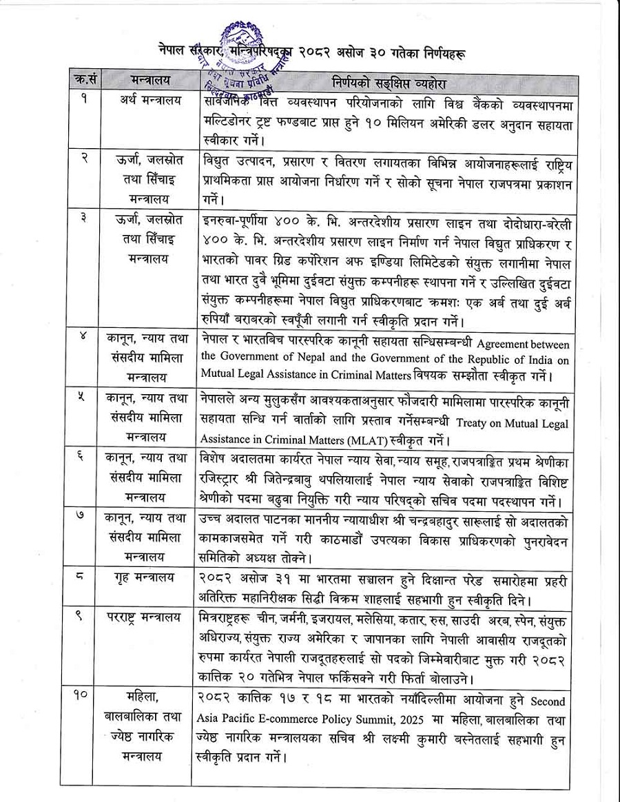 असोज ३० गतेको मन्त्रिपरिषद्को बैठकका २० निर्णयहरु सार्बजनिक