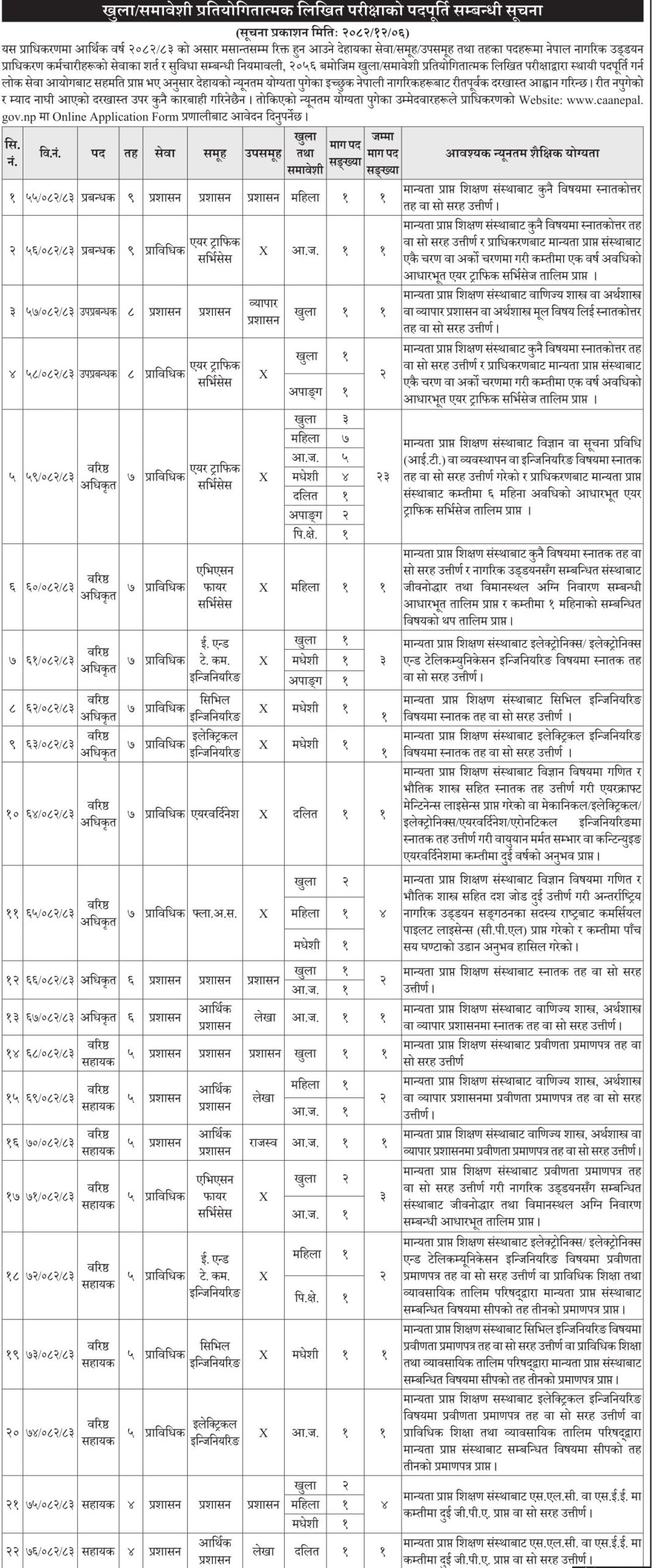 काठमाडौं । नेपाल नागरिक उड्डयन प्राधिकरणले विभिन्न पदमा ७५ जना कर्मचारी माग गर्दै दरखास्त आह्वान गरेको छ । प्राधिकरणले शुक्रबार सूचना जारी गरी तह ९ देखि तह ४ सम्मका विभिन्न पदमा कर्मचारी माग गर्दै दरखास्त आह्वान गरेको हो ।