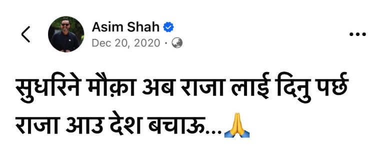 काठमाडाैं । प्रधानमन्त्री बालेन्द्र शाहले संविधान संशोधनको बहसपत्र बनाउने जिम्मेवारी दिएका असिम शाह राजतन्त्रसँग सकारात्मक भएको देखिएको छ । पाँच वर्षअगाडि सामाजिक सञ्जालमा शाहले लेखेका थिए, ‘सुध्रिने मौका अब राजालाई दिनुपर्छ । राजा आऊ देश बचाउ ।’