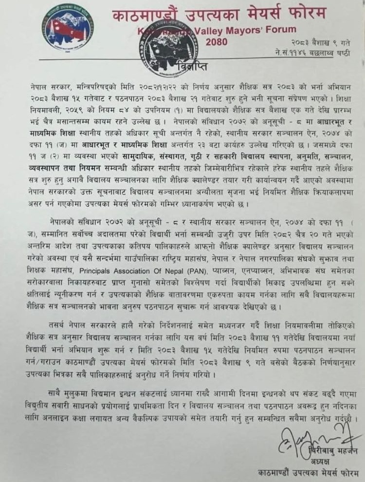 काठमाडौं । ‘काठमाडौं उपत्यका मेयर्स फोरम’ले संघीय सरकारको निर्णय अस्वीकार गर्दै नयाँ शैक्षिक सत्र २०८३ का लागि आफ्नै तालिका सार्वजनिक गरेको छ । फोरमले उपत्यकाका विद्यालयहरूमा वैशाख ११ गतेदेखि भर्ना अभियान र वैशाख १५ गतेदेखि नियमित पठनपाठन सुरु गर्ने निर्णय गरेको हो ।